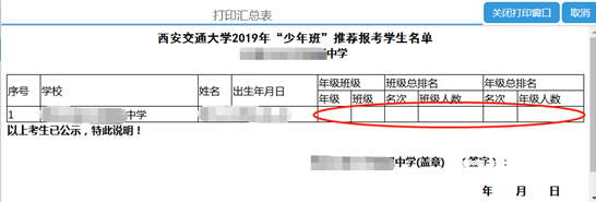 15.点击页面上方“打印汇总表”,打印报名学生汇总名单。汇总表打印出来后需要手工填写班级、年级、综合排名等信息。