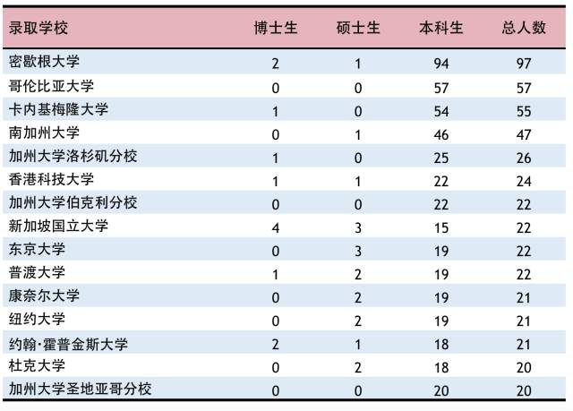 录取上海交大毕业生排前三位的国(境)外高校分别是密西根大学(University of Michigan)、哥伦比亚大学(Columbia University)和卡内基梅隆大学(Carnegie Mellon University)。根据 2017 年英国《泰晤士报》较新排名,上海交大有504名毕业生赴世界排名前30位大学留学深造。
