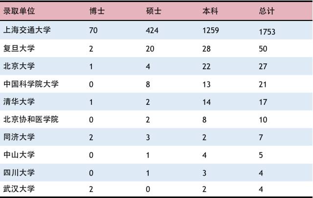 除本校外,录取上海交通大学毕业生人数排前三位的高校和科研院所分别是复旦大学(50 人)、北京大学(27 人)、中国科学院大学(21 人)。